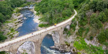 En selle ensuite pour emprunter la Dolce Via vers Le Cheylard et la vallée de l'Eyrieux. Ici plus de train, mais l'ancienne voie de chemin de fer a laissé place à une magnifique voie verte en pente douce jusqu'à la vallée du Rhône. Pour clôturer ce tour, vous remontez le cours du fleuve en suivant ViaRhôna jusqu'à Tournon.