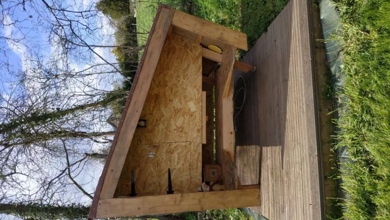 L'abri'cyclette est une cabane pour 2 personnes pour dormir bien à l'abri, manger confortablement assis à une table abritée. La cabane est raccordée au réseau d'électricité.