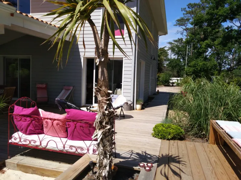 Située à la pointe du Médoc, entre dune et forêt de pins, à 300 mètres de l'océan, Sophie vous accueille dans sa maison d'hôtes à ossature bois. Aménagée dans une dépendance de la maison principale, les trois chambres de 22 m2 chacune disposent d'un accès entièrement indépendant et d'une terrasse privée à l'ombre des pins. Elles sont équipées d'une salle d'eau avec douche à l'italienne ouverte sur la chambre, d'un wc séparé et d'une climatisation réversible. Décorées avec soins, vous apprécierez leur atmosphère personnalisée à l'esprit nature, bord de mer et romantique. Le jardin vous offrira d'agréables moments de détente.Les petits déjeuners copieux seront servis dans la salle à manger ou sur la terrasse selon la saison.