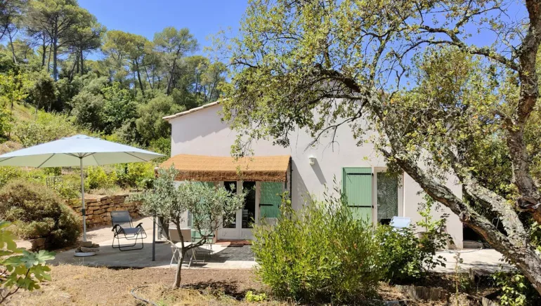 - une grande chambre lumineuse sous plafond cathédrale, dotée d'une terrasse avec pergola et salon de jardin, dans un environnement calme avec vue panoramique sur le massif des Maures. Elle dispose d'une salle d'eau avec douche à l'italienne et deux lavabos.