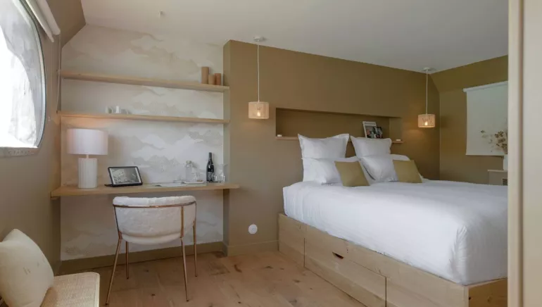 La péniche comprend 5 cabines traversantes de 20m2 (dont l'une peut accueillir une 3ème personne dans un lit 1 place en mezzanine ). Elles occupent l'ancienne cale et se situent légèrement au dessous du niveau du fleuve. Les larges hublots de chaque côté du lit participent à la sensation de flottement et de calme qui gagnent les corps et les esprits.