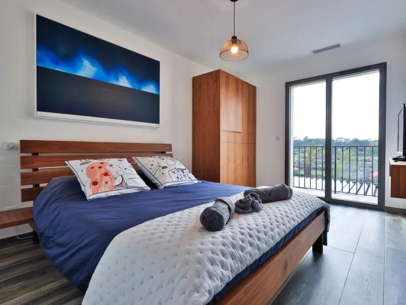 Chambre Kean : 27m² sud/sud-Ouest avec balcon vue piscine, lit 160x200 à mémoire de forme orientée, salle de bain avec double vasque et douche à l’italienne.