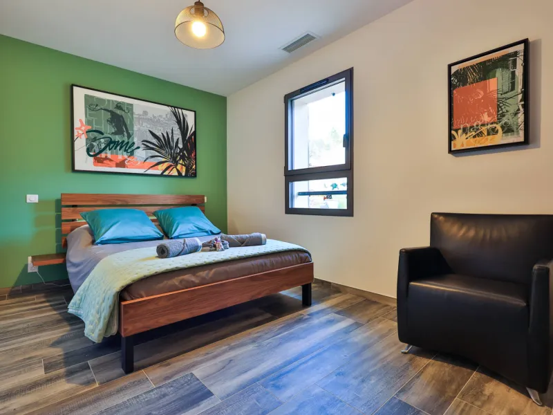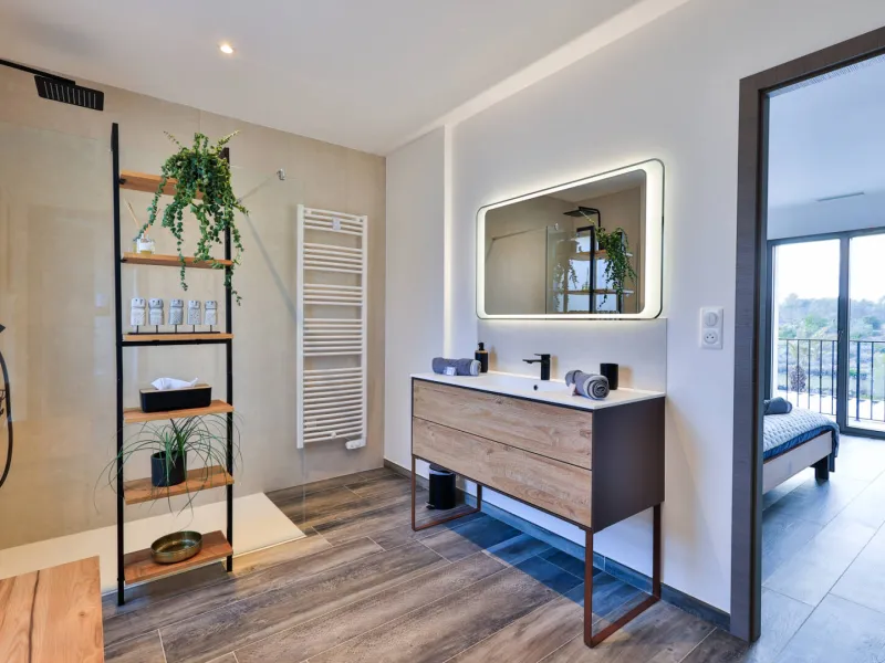Chambre Niack : 25m² orientée Est, lit 140x200 à mémoire de forme, salle de bain avec double vasque et douche à l’italienne.