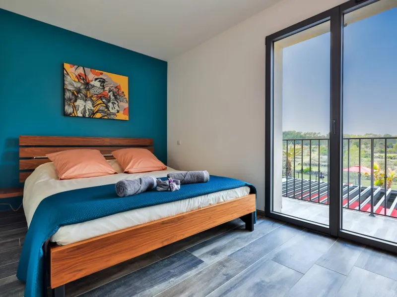 Chambre Missy : 22m² orientée Ouest avec balcon vue piscine, lit 160x200 à mémoire de forme, salle de bain avec double vasque et douche à l’italienne.