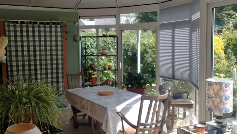 Le petit-déjeuner bio est servi dans la véranda ensoleillée, face au jardin fleuri (en saison).