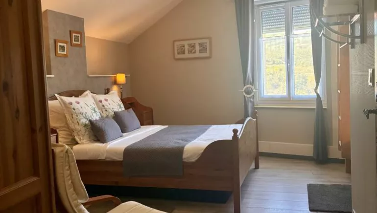 Chambre climatisée de 27 m2 aux tons chauds au 2ème étage d'une belle maison vigneronne, offrant un lit en 160 et un lit superposé en 90.