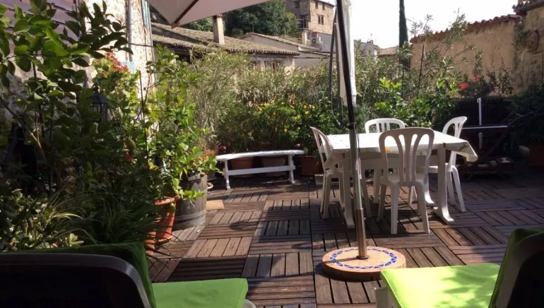 Chambre de 21m² avec cabinet de toilettes, douche et WC. Télévision, Internet et entrée indépendante. Grande terrasse avec salon de jardin et coin lecture.