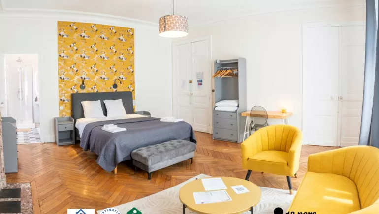 Toutes nos chambres font au moins 20 m2 (hors salle de bain), chacune a son parquet d'origine, une cheminée en marbre, un lit queen-size, et tous les accessoires que vous attendez d'un hébergement de qualité. La table d'hôtes vous est ouverte sur réservation. Notre Cheffe vous propose des menus équilibrés à partir de produits locaux et de saison.