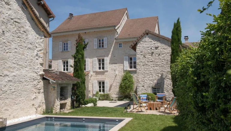 Au rez-de-chaussée, les hôtes disposent de plusieurs espaces de vie conviviaux : un salon avec cheminée, un espace repas lumineux et un salon de musique voûté plus intimiste, agrémenté d’un piano. Aux beaux jours, la terrasse et le jardin invitent à la détente autour de la piscine au sel, dans un environnement paisible propice au repos.