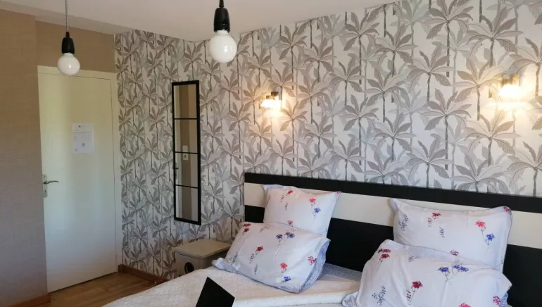 Au rez-de-chaussée, la chambre 'Les Plomarch' avec 1lit 2p, salle d'eau avec douche à l'italienne et wc. Accès direct au jardin par un escalier.