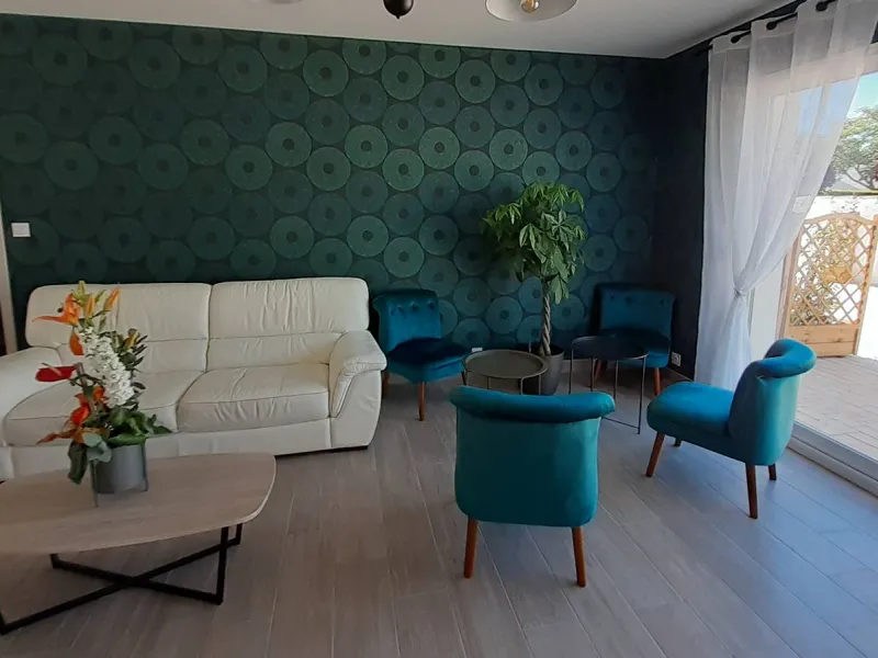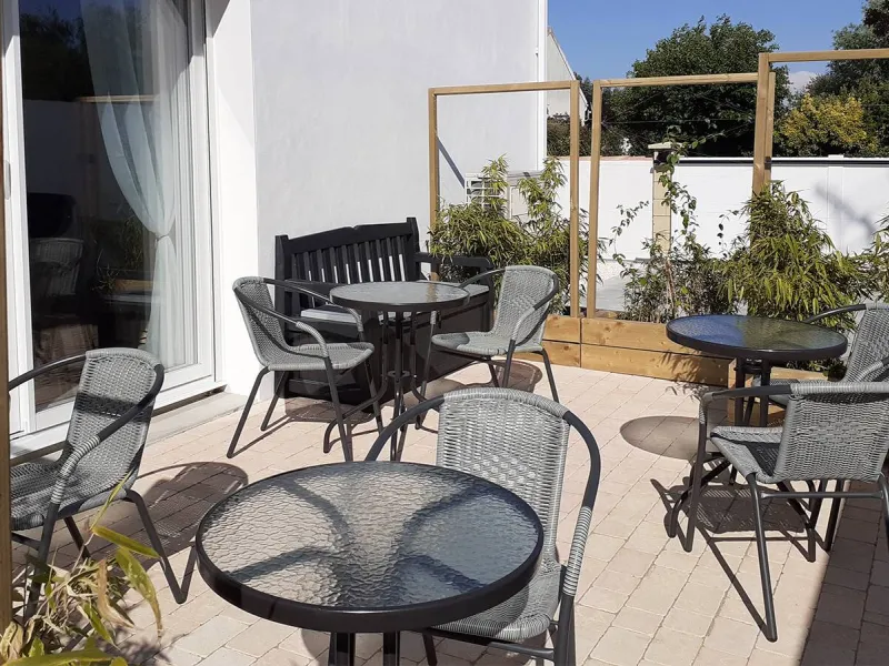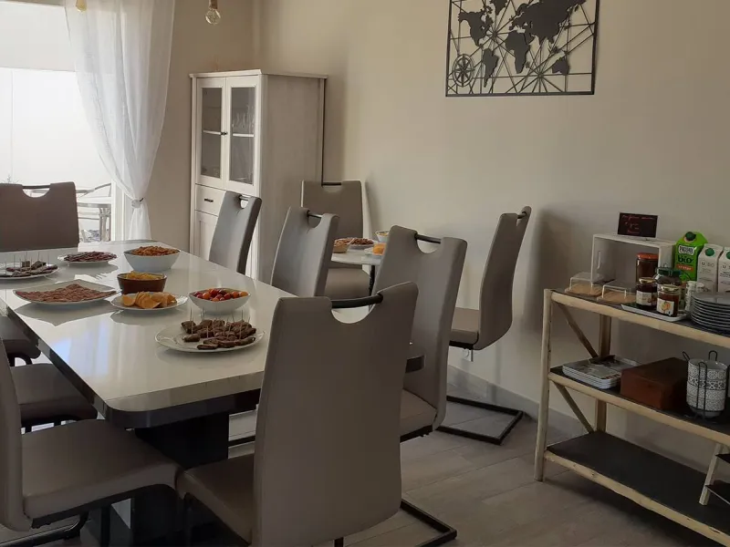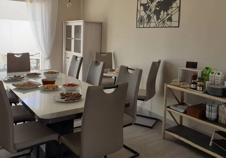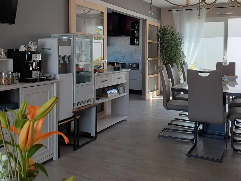 La pièce de vie se compose d'un coin salon (canapé cuir et petits fauteuils en velours) et d'un séjour équipé d'une grande table de 6 à 8 couverts ainsi qu'une table bistrot pour 2 personnes. Les hôtes ont à leur disposition en libre-service : une cafetière, une bouilloire, un micro-ondes, un réfrigérateur, un grille pain, une fontaine à eau (température ambiante et eau fraiche).