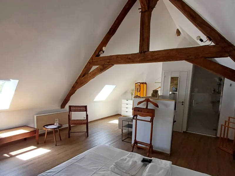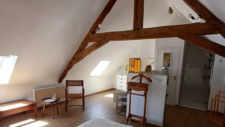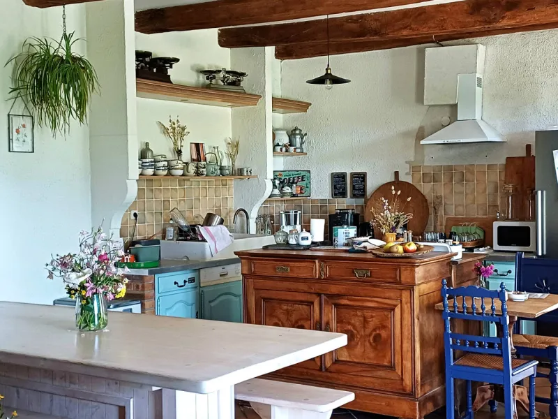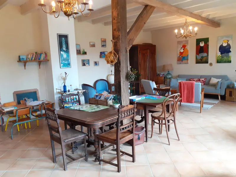 La partie du bâtiment avec les chambres d'hôtes, la cuisine avec table et la grande pièce à vivre/salle à manger est entièrement PRIVATISABLE.