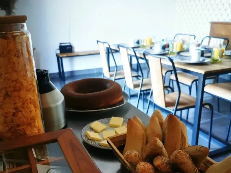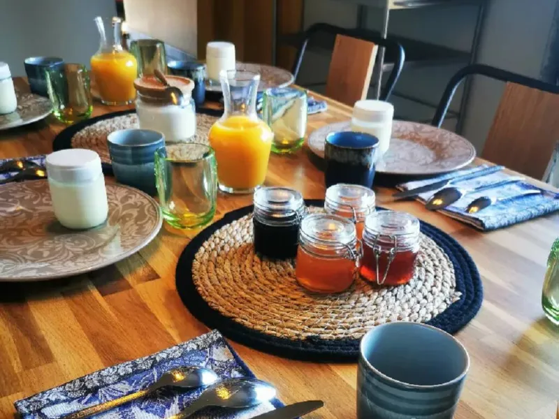 Nos petits-déjeuners sont servis en terrasse à la belle saison, face à la piscine. Ils sont composés de produits bio, locaux et de saison, entièrement fait maison.