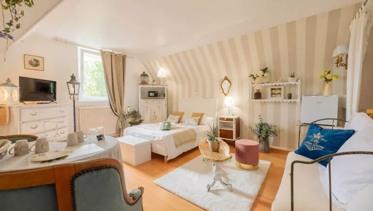 Nichée au cœur de Sedan, une charmante ville aux richesses historiques, se trouve une chambre d'hôtes qui invite à la douceur et à la sérénité : La Villa Notre Dame - Un été en Provence. Dès que vous franchissez le seuil, vous êtes accueilli par une ambiance shabby chic qui enveloppe les lieux d'une atmosphère chaleureuse et apaisante.La décoration, soigneusement pensée, allie le vintage et le moderne avec une aisance remarquable. Des murs aux tons pastel, ornés de délicates moulures anciennes, créent un cadre idyllique. Les meubles, dénichés ici et là, présentent un subtil mélange de bois patiné et de tissus fleuris aux motifs délicats. Chaque pièce a son propre charme, des armoires aux portes en bois vieilli aux chaises recouvertes de lin, tout évoque une élégance nostalgique.La chambre, spacieuse et lumineuse, offre une vue imprenable sur le jardin fleuri où des roses et des hortensias dansent au gré du vent. Les grandes fenêtres, habillées de rideaux légers, laissent entrer la lumière naturelle, éclairant le lit drapé de coussins moelleux et d'une couette douillette. Un coin lecture,, invite à se plonger dans un bon livre tout en écoutant la nature environnante.Les installations modernes, tout en respectant l’esprit rétro, apportent un confort indéniable. Une salle d'eau joliment équipée promet des moments de détente inoubliables après une journée de découverte des trésors de Sedan.Le petit déjeuner est un véritable festin, servi en chambre, ou en fonction de la saison, sur la terrasse de la bâtisse. Vous y dégusterez du pain frais et des pâtisseries délicates, le tout accompagné d'un café ou d’un thé aromatique.La Villa Notre Dame - Un été en Provence est l’endroit idéal pour s’évader, se ressourcer et savourer le temps qui passe, dans un décor où chaque détail raconte une histoire. Que ce soit pour une escapade romantique, une aventure entre amis, ou un moment de paix en solo, cette chambre d'hôtes vous promet une expérience inoubliable, empreinte de douceur et d'authenticité.