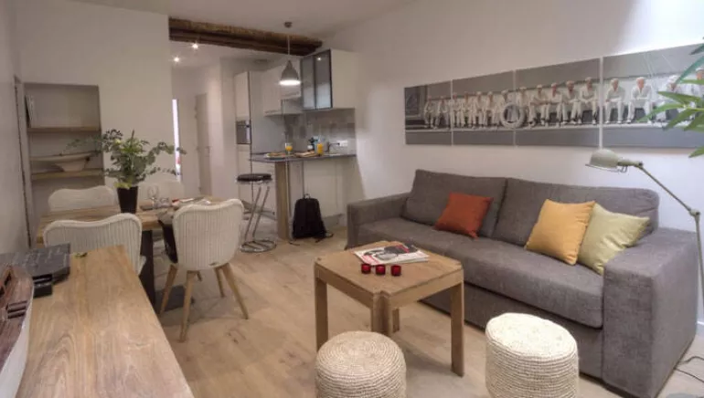 Ce grand appartement de type T2, situé au premier étage, est composé d'une chambre équipée d'une literie haut de gamme de 160x200 avec une armoire en teck, d'une salle de bain avec une grande douche à l’Italienne, sèche-cheveux professionnel et linge de bain et de toilettes indépendantes. Il dispose également d’une cuisine américaine entièrement équipée (four, four micro-onde, réfrigérateur, lave-vaisselle et cafetière Nespresso avec comptoir), d'un grand salon chic avec verrière et mur en pierre, d'un canapé haut de gamme convertible, d'un espace repas, d'une télévision à écran plat de 109 cm avec les chaines Orange. L'appartement est équipé d'une connexion WIFI gratuite.