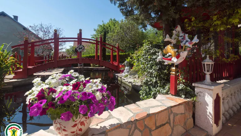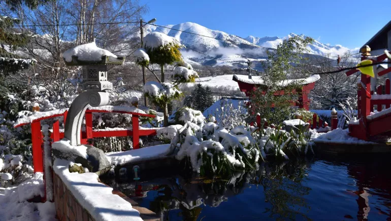 Très joli jardin paysager fleuri et arboré d'inspiration japonaise avec un grand bassin et ses carpes Koï.