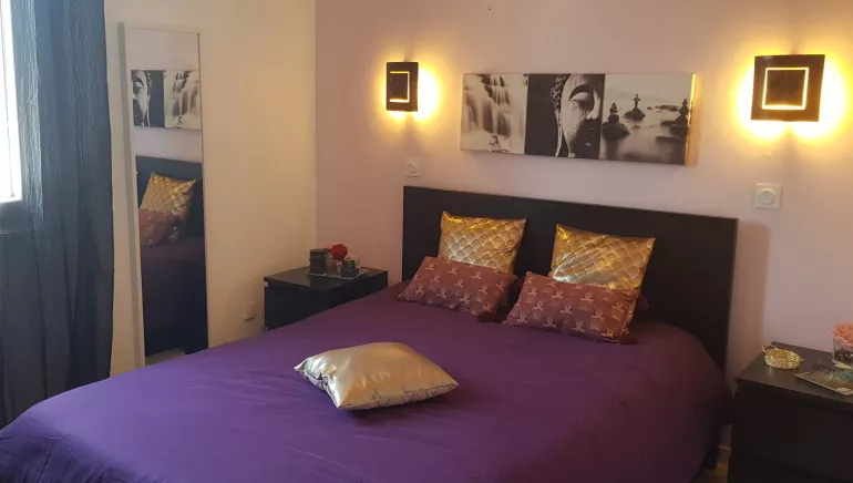 Une chambre familiale avec un lit 140 également et deux lits simples.