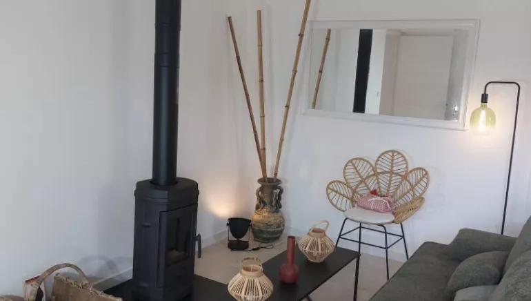 - une pièce à vivre avec salon (canapé, table basse, poêle à bois (fourniture du bois compris dans le prix) fauteuil, table de salle à manger avec 6 chaises), cuisine ouverte toute équipée avec bar et tabourets (lave-vaisselle intégré, plaque à induction, hotte, robots) et sa zone technique (four, micro-ondes, combiné lave-linge, sèche-linge, réfrigérateur, congélateur),