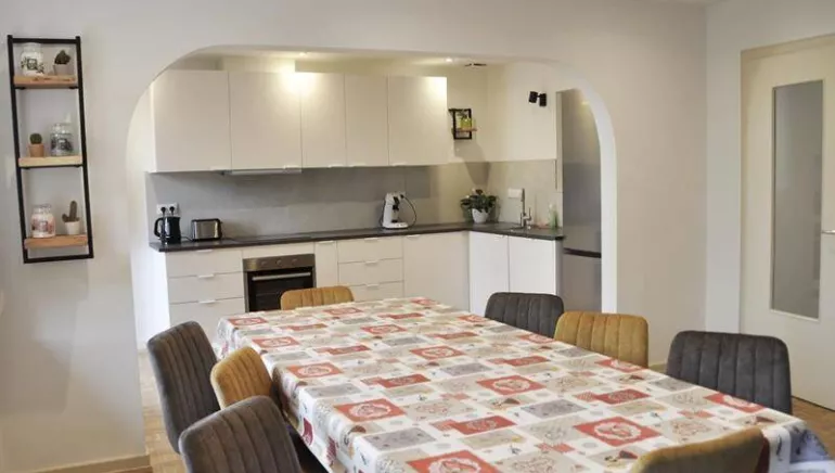 Maison mitoyenne de 5 pièces (4 chambres). Double garage privé, une place de stationnement. Petite terrasse couverte.