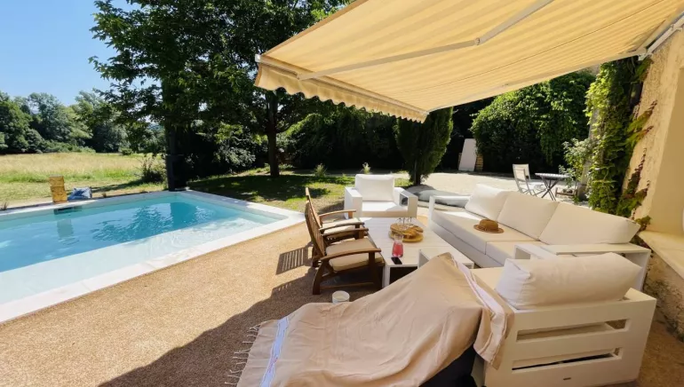 La grande terrasse extérieure devient le lieu de vie central lorsque les températures provençales se font douces : repas au soleil, moments de lecture ou apéritifs sous le ciel bleu. La piscine privative chauffée complète ce tableau idyllique, offrant un cadre détente avec une vue imprenable sur les prairies et la nature environnante.