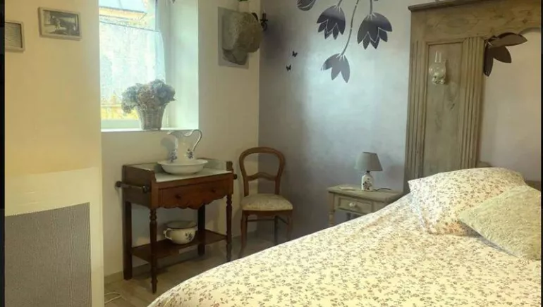 Maison de bourg dans une petite rue avec terrasse surélevée chambre (1 lit 2 personnes 160 cm, possibilité lit bébé), salle d'eau (douche à l'italienne) et wc indépendant. Local vélos ou motos avec buanderie au rez de chaussée (un supplément peut être demandé). Les draps et le linge de maison sont fournis . Possibilité de fournir des petits déjeuners sur demande.