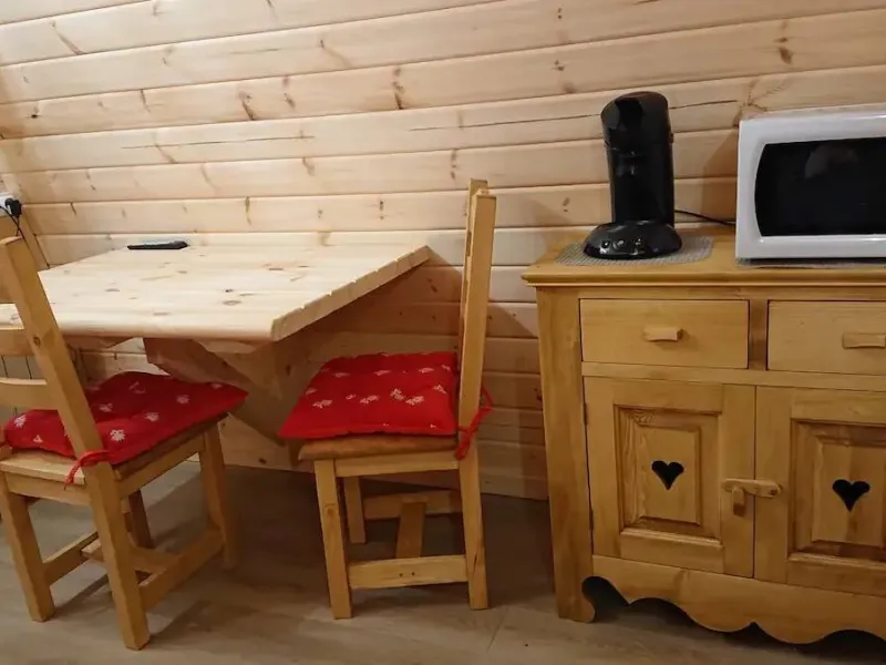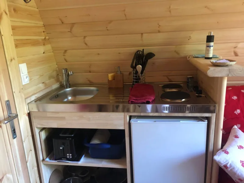 Cuisine équipée ( frigo, plaque de cuisson, micro onde, cafetière, bouilloire, vaisselle ...)