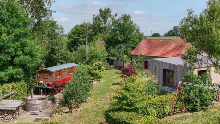 Propriété entièrement indépendante et isolée. RDC : grande pièce à vivre avec salon et cuisine aménagée (poêle à granulés), chambre avec claustras sur fenêtre du couloir (lit 2 pers. 160 cm), chambre (lit 2 pers. superposés avec lit 1 pers.), salle d'eau, wc indépendant. 2 terrasses. Chauffage granulés et électrique. Alimentation en eau de source. BAIN SCANDINAVE 40°c extérieur 6 pers que vous aurez la joie de mettre en route (environ 3 h) pour 3 soirées. PISCINE (9.3x3.5m, profondeur 1m20) privative de 9h à 18h (partagée avec propriétaire au delà) + 22h pour 2 nuits, et chauffée si nécessaire de mai à mi-septembre. Terrasse 100 m². Balançoire, barbecue gaz. Terrain avec jardin partiellement clos entouré de prés. Tarif pour 5 pers. Si dépassement : +40 €/pers/jour. En complément Roulotte de bohème (lit 2 pers. 160 cm en alcôve) : 200 €/semaine, 100€/week-end et 50€/nuit sup, en face du gîte, exclusivement loué avec le gîte. SOIT UNE CAPACITÉ : 7 PERS. AU TOTAL. Caution CB uniquement