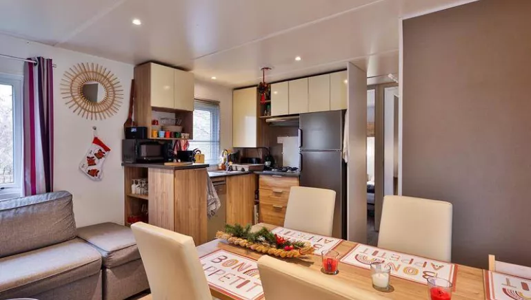 Mobil-home haut de gamme côté rivière du Parc de la Fecht, récent, composé de 3 chambres (1 lit double 160x200 en suite parentale, 2 lits simples 80x190et 2 lits gigogne 70x190) avec 2 SDB et 2 WC, climatisation réversible, chauffage dans toutes les chambres, entièrement équipé, téléviseur, terrasse couverte avec table de jardin et plancha à disposition. Chaque lit est pourvu d'oreillers, d'une couverture et d'une couette (kit de couchage, draps et linge de toilette en option). Isolation 4 saisons. Cafetières Nespresso, Senseo et à filtre. Carafe filtrante. WIFI gratuit. Lave linge.