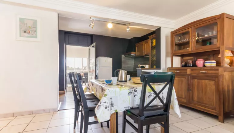 Salon/séjour avec cuisine aménagée ouverte, véranda, 3 chambres accessibles par 3 marches (1-2: lit 160x200, 3: 2 lits 80x190), s.d.b/wc.