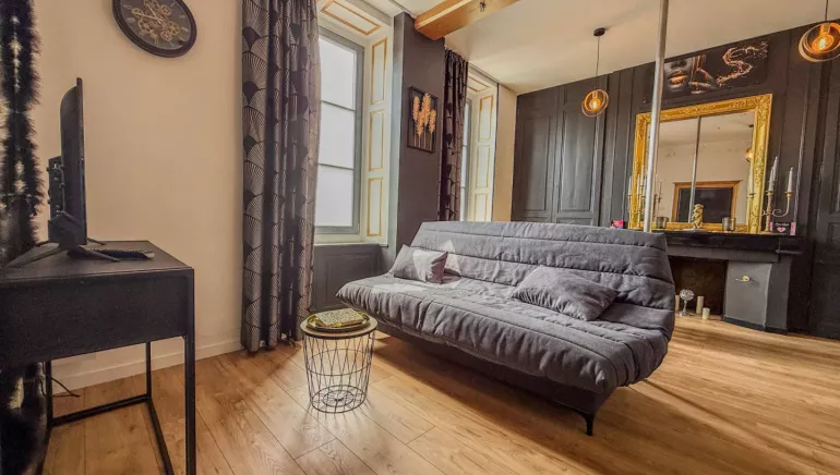 A l'intérieur : une cuisine fonctionnelle pour des repas romantiques à partager en tête-à-tête. Un coin salon avec mange-debout. La chambre spacieuse est équipée d'un luxueux lit double (180x200) où vous pourrez vous abandonner aux bras de Morphée dans un confort absolu. Cette chambre est équipée d'un vidéoprojecteur, de miroirs, de pétales de roses. Non loin se trouve une table de massage. La salle de bain, avec sa douche et sa baignoire, invite à la détente et au bien-être, pour des instants de relaxation en toute intimité. Un WC séparé assure votre confort. Parking public gratuit à proximité. Un patio clos vous offre un espace extérieur privé. Profitez du beau temps en dégustant des repas en plein air grâce au salon de jardin et au barbecue mis à votre disposition. Laissez-vous envelopper par l'étreinte dorée de ce gîte romantique, où chaque détail est pensé pour vous offrir une expérience inoubliable.