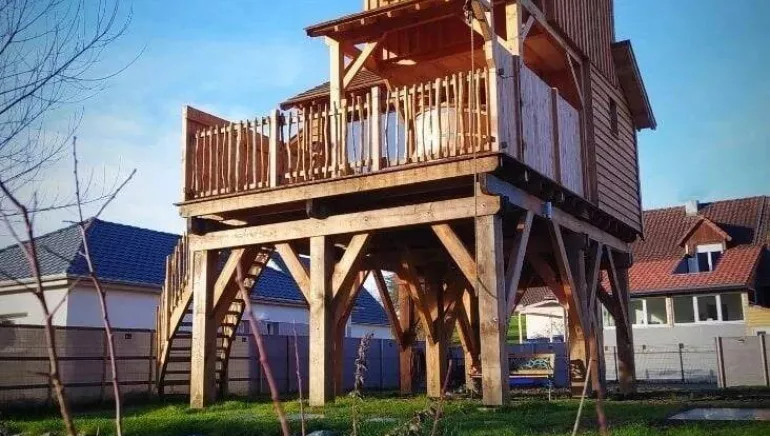 La cabane au bain perché est un gîte de type cabane sur pilotis, elle se dresse entre deux pavillons résidentiels dans la toute petite rue des lys à Aspach. Ce véritable chalet a été conçu de sorte à ce que ses occupants se sentent isolés du monde, les fenêtres de part et d'autre sont martelées pour ne laisser passer que la lumière et les brises vue de la terrasse permettent une intimité totale.
