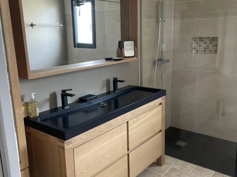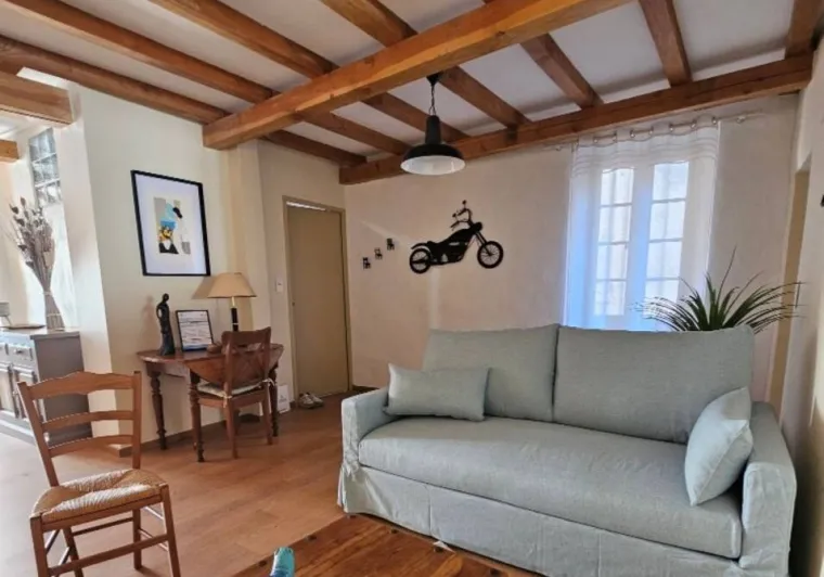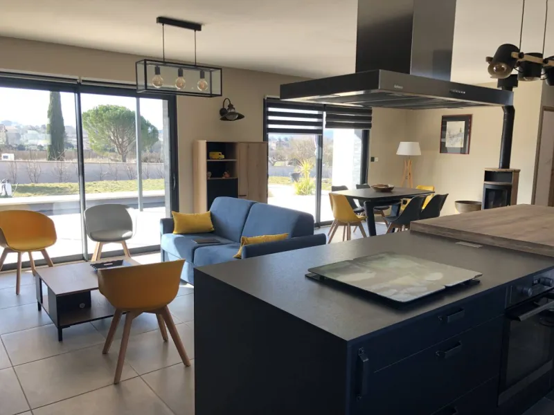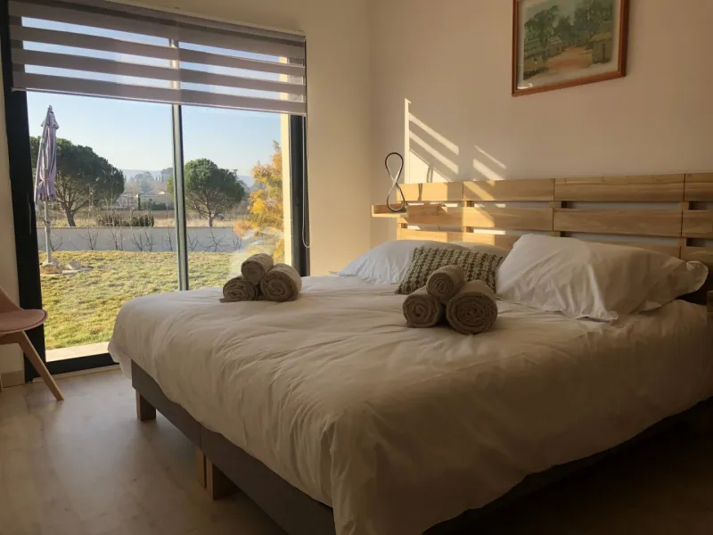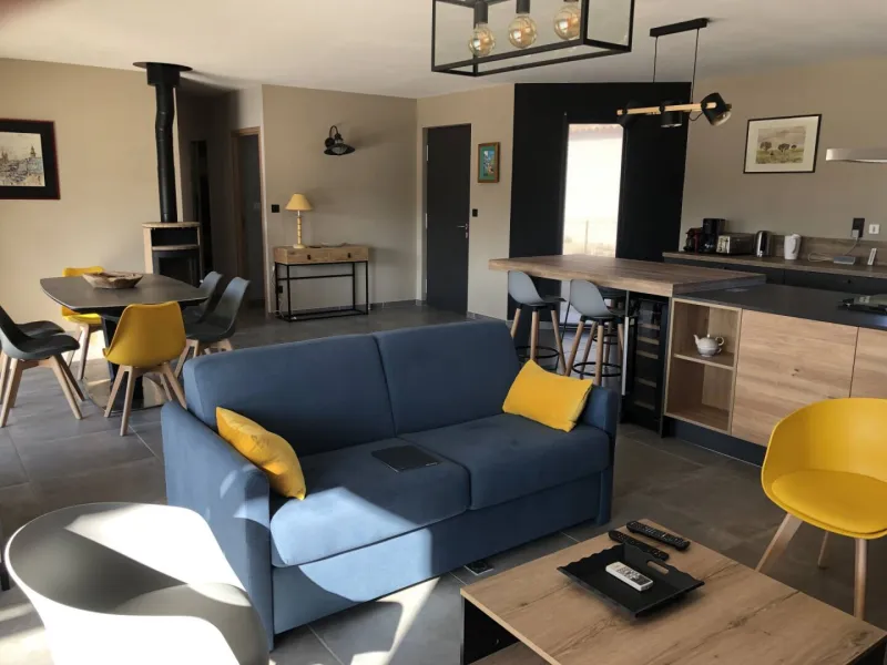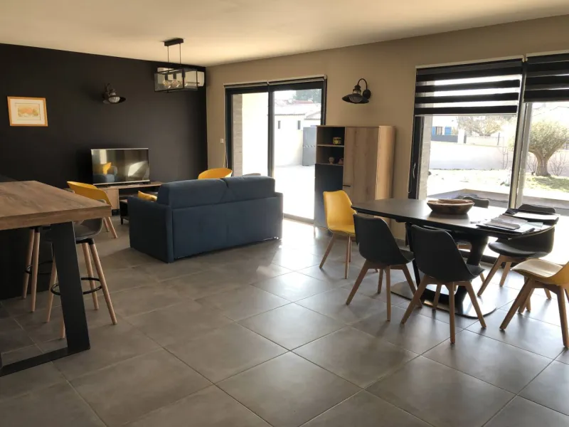 Ce meublé de 110m² se situe sur un terrain de 950m² et bénéficie d'un garage et d'une terrasse plein sud.Une chambre avec lit double de 180 x 200.