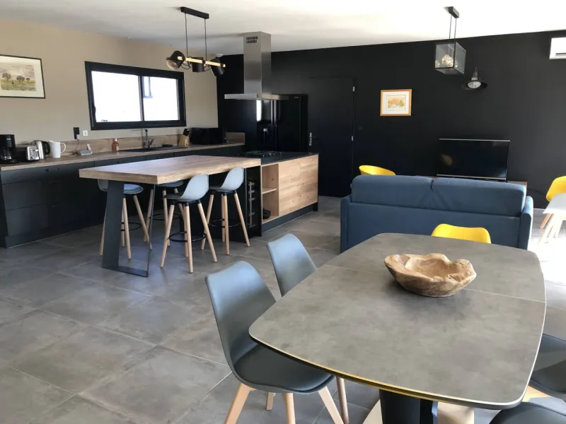 Une pièce de vie de 50m² comprenant une grande cuisine, un salon, une salle à manger.