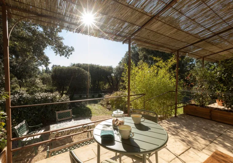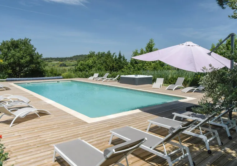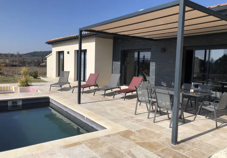 A l'extérieur une grande terrasse de 60m² équipée de mobilier de jardin et d'une pergola avec table et 6 chaises ainsi qu'un parasol. Une piscine avec bains de soleil.