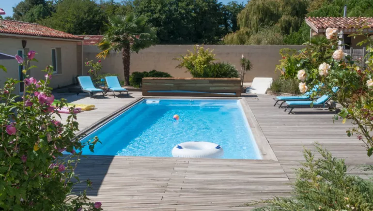 A côté de la terrasse, vous trouverez détente au bord de la piscine chauffée à 27°c, nage à contre sens et jacuzzi à l'intérieur de la piscine (mai à sept) à partager avec 2 chambres d' hôtes (à partir de 16h) et les propriétaires (2 pers), bains de soleil, pool house, douche extérieure.