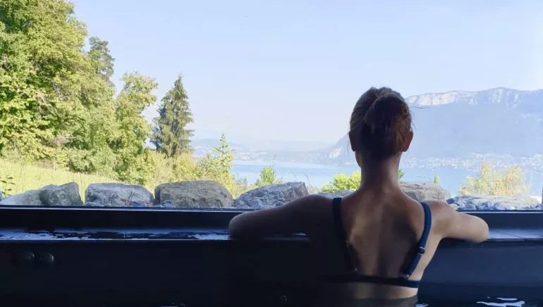Plongez dans la douceur de notre jacuzzi ou détendez-vous dans la piscine couverte, tous deux offrant une vue imprenable sur le lac. Une parenthèse de sérénité, où le temps s’arrête et où chaque instant est une invitation à la relaxation.