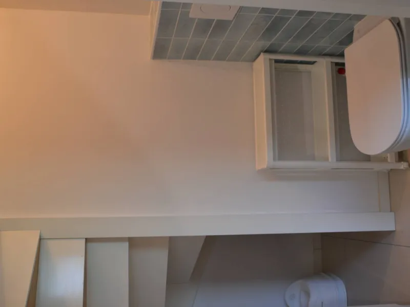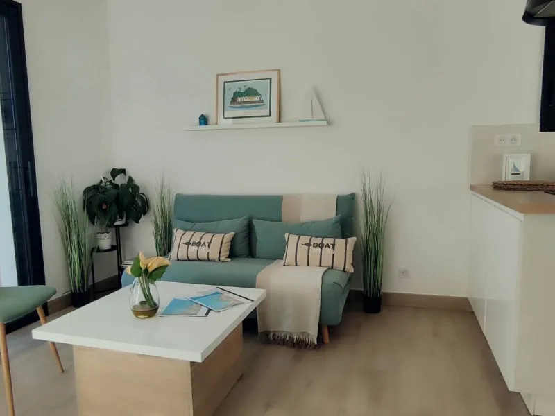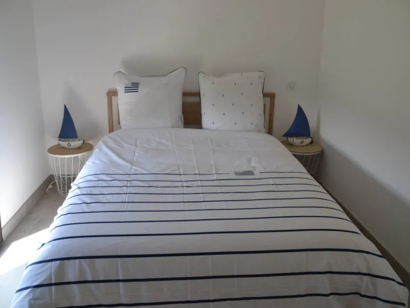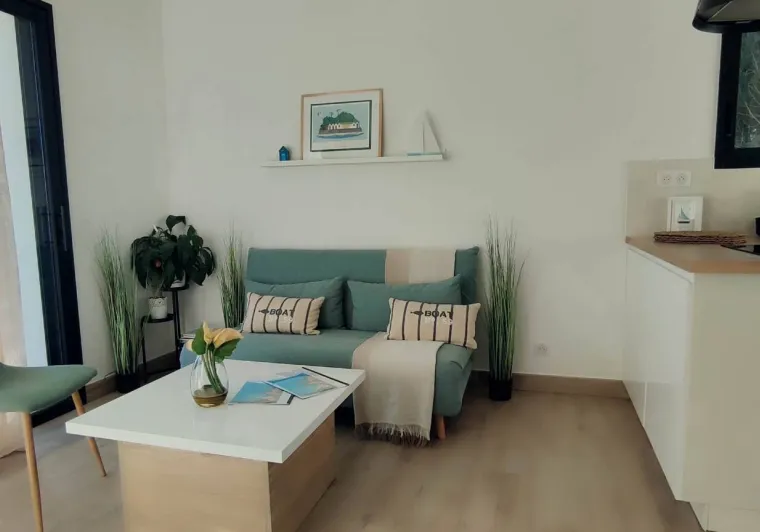 La maison, de conception inversée, propose deux chambres avec lits doubles et une salle d'eau avec douche à l'italienne au rez-de-chaussée, tandis que le salon et la cuisine entièrement équipée se trouvent à l’étage supérieur. Cette disposition permet de profiter pleinement de la vue sur la mer depuis la terrasse commune.