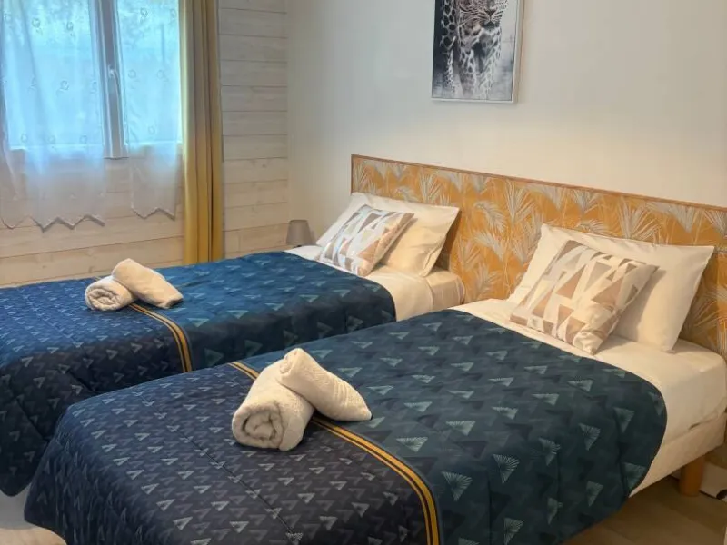 Accès par un escalier intérieur au 2ème niveau. Cuisine équipée avec espace repas. Un salon indépendant avec écran plat. 1 ch avec 2 lits 90, sa salle d'eau et son WC privatifs. 1 ch avec 1 lit 160, sa salle d'eau et son WC privatifs.