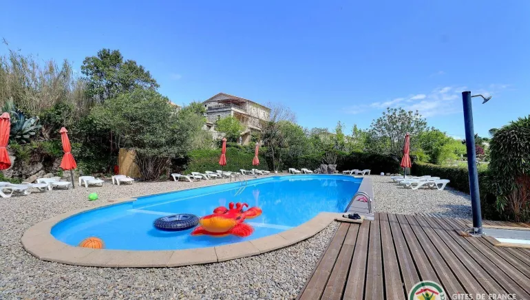 Chaque gîte a son entrée indépendante et une connexion internet privée. La pièce principale propose : cuisine/séjour ( gazinière 4 feux, lave vaisselle, micro ondes, grand réfrigérateur congélateur, salon , fauteuils,TV. La chambre 27 m² éclairée par une large baie vitrée comprend 1 lit en 140 et un lit en 90 supplémentaire. Vous trouvez également un second lit en 140 dans une chambre alcôve, partiellement fermée. La salle d'eau comprend un WC, douche avec marche d'accès, bidet et une vasque. La grande piscine partagée, parfaitement clôturée et sécurisée, dont les dimensions de 18 mètres de long et de 6 mètres de large avec une fosse à plonger de 2,50 mètres et un bassin pour enfants en font un atout majeur compte tenu de la capacité totale de nos gîtes. Elle est ouverte de début juin à fin septembre. Parking clos et commun. Terrain de pétanque et autres loisirs sur place (baby-foot) à partager avec les autres gîtes sur place.