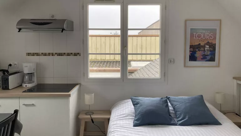 Studio de 15m² (**). A l'étage. Entièrement meublé. Location pour courtes, moyennes durées. Ce gîte se situe à quelques minutes à vélo du centre de Tours. Prestations de qualité. Chauffage au sol. Rangement. Cuisine entièrement équipée.