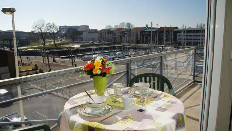 Appartement de 43m², 2ème étage avec ascenseur, 2 pièces : salon-séjour (clic clac 2 pers.), coin cuisine équipé, 1 chambre (1 lit 160). Salle de d'eau. Balcon. Buanderie à la résidence avec lave linge et sèche linge communs. Parking public à proximité. Vue d'angle sur le port de plaisance.