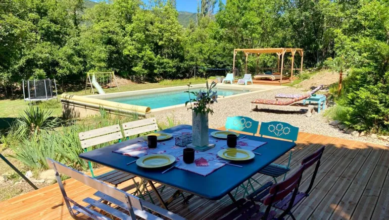Le gîte est situé au cœur du Parc Naturel Régional des Baronnies Provençales, entre les lavandes, les tilleuls et l'Ouvèze. Cette rivière (Rio en espagnol) est accessible de manière privative et borde le terrain d'un hectare qui offre de nombreux espaces (plage de rivière, coin lecture, prairie, terrain de jeux) où s'intègre aussi une magnifique piscine (10x5m).