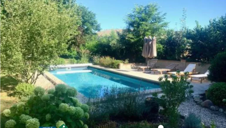 À l'arrière de la maison, une terrasse ombragée sous tilleul centenaire accueille vos repas d'été ou vos pauses lecture. Le jardin arboré et fleuri, non clos, invite à la détente, avec ses coins ombragés, sa cabane perchée, et sa piscine sécurisée (10x4 m, profondeur 1,5 m) parfaite pour les beaux jours.
