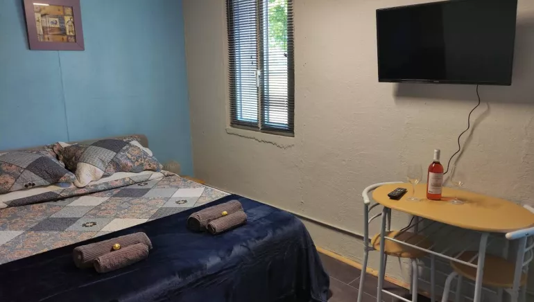 Le studio dispose d'une kitchenette, d'une table et de chaises, d'un lit double et d'une salle de bain attenante. Il est équipé d'une télévision avec chaînes françaises et de nombreux médias (Netflix, Disney+, etc.) ainsi que du Wi-Fi par fibre optique. Le linge de maison et les serviettes sont fournis. Pour votre confort, des ustensiles de cuisine, de la vaisselle, des verres, une plaque de cuisson 2 plaques et un micro-ondes sont également à votre disposition. Le studio est un pied-à-terre idéal pour travailler ou se détendre.