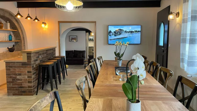 L’hébergement peut accueillir jusqu’à 17 personnes. Il se compose de 7 chambres dont une est accessible aux P.M.R., 11 lits, 3 salles de bain et une salle d’eau, 5 wc, d’un grand salon salle à manger et d’une cuisine toute équipée (lave-vaisselle). Profitez également de la terrasse aux beaux jours, avec barbecue, table de jardin et salon de jardin.