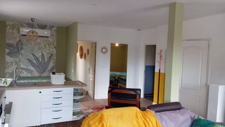 Terrasse et accès jardin. Cuisine-séjour équipée de plaques induction, réfrigérateur-congélateur, four, lave-vaisselle, lave-linge, bouilloire, machine à café expresso broyeur. Salle de douche avec double vasque, wc séparé. 1 chambre avec 1 lit de 160x200 et 1 chambre avec 1 lit de 180x200 et 1 lit de 90x200. Porte vitrée donnant sur la terrasse couverte orientée plein sud.