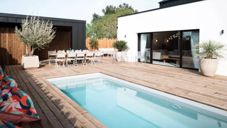 Charmant espace extérieur clos de 150 m² avec très belle terrasse bois et piscine privative chauffée (6x2,50m).