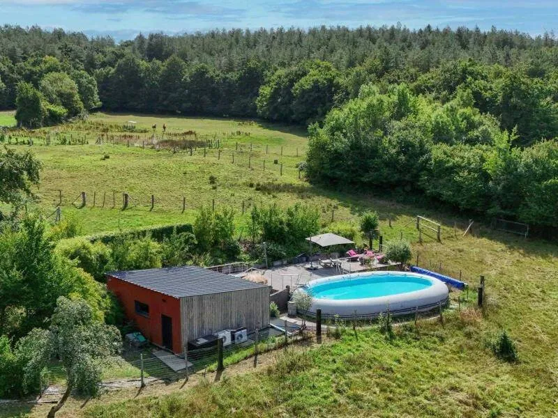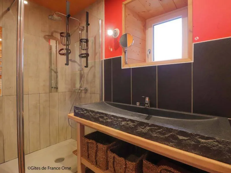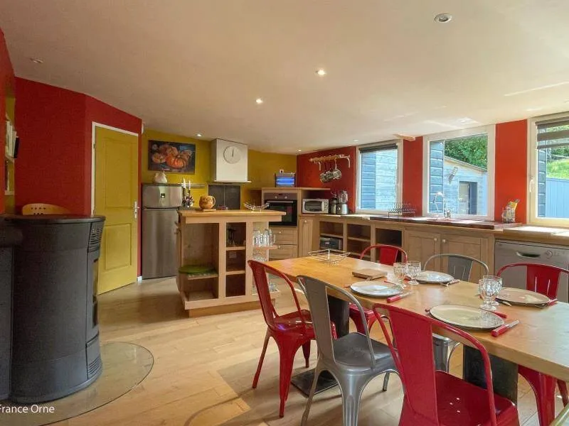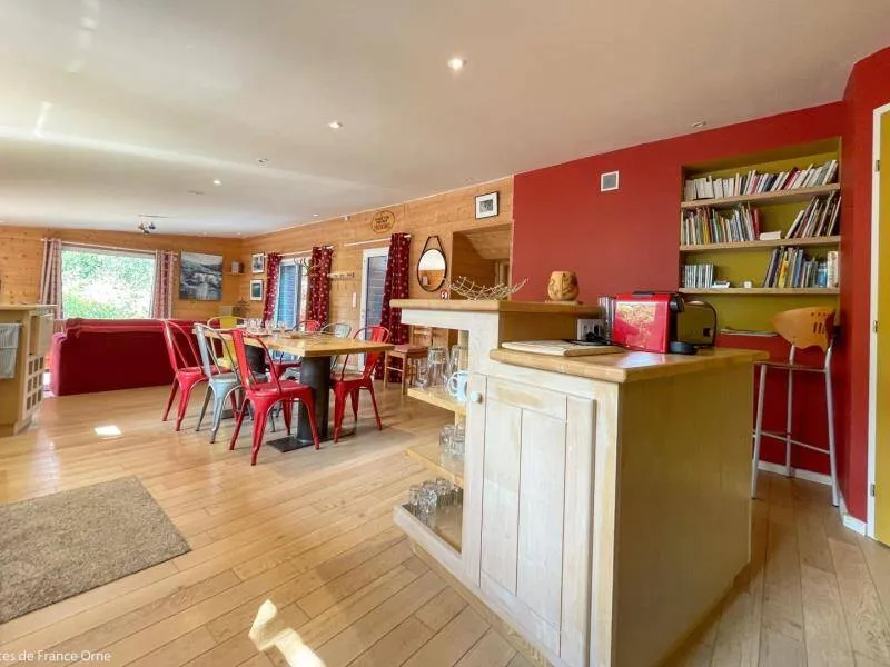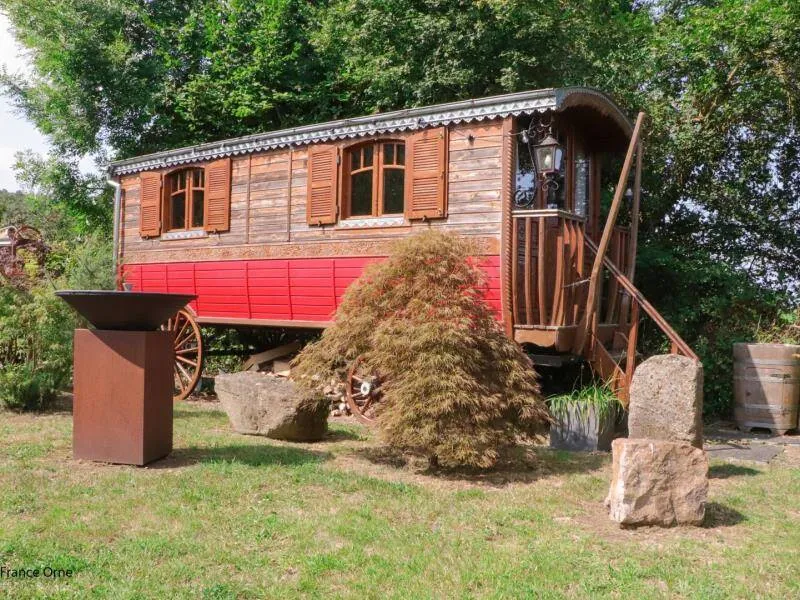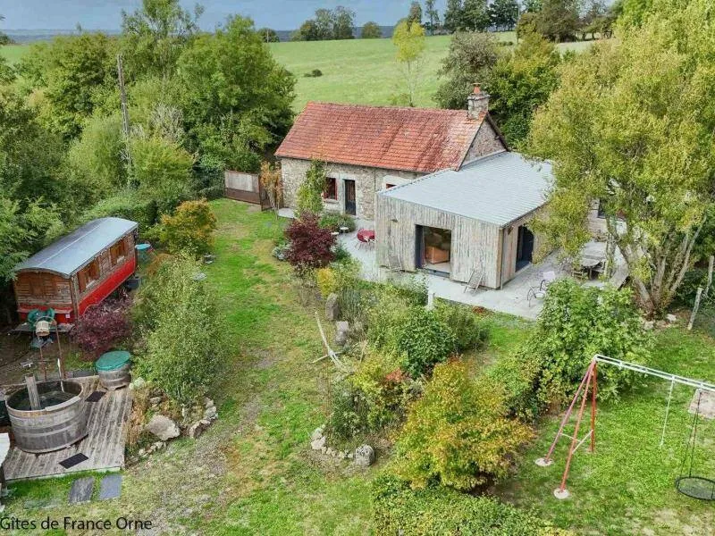 Un environnement exceptionnel sur une propriété de 6 ha entourés d'herbages de chevaux en lisière de forêt d'Ecouves avec le GR36, ce gite a été décoré dans une ambiance chaleureuse de montagne avec des murs en pin, des rideaux rouges et une cuisine en frêne. Ne pas manquer le bain nordique à 40°c de nuit, même en hiver, pour apprécier la tranquillité et écouter la faune nocturne !!! Il est réparateur et relaxant après une journée de balade en forêt, un footing ou une randonnée à vélos; Location de 2 VTT et/ou 2 VTC sur place : 25 euros la journée. Itinéraires de balade à pied et à vélo fournis. Nous partons sur les chemins de la forêt, sur les petites routes de campagne chaque semaine et nous pourrons vous donner de nombreuses idées de balades. Arrivée avancée ou départ repoussé : 25 euros de l'heure (toute heure commencée est due). La piscine est ouverte de 9h à 18 h du 1 er mai à septembre.Propriété entièrement indépendante et isolée. RDC : grande pièce à vivre avec salon et cuisine aménagée (poêle à granulés), chambre avec claustras sur fenêtre du couloir (lit 2 pers. 160 cm), chambre (lit 2 pers. superposés avec lit 1 pers.), salle d'eau, wc indépendant. 2 terrasses. Chauffage granulés et électrique. Alimentation en eau de source. BAIN SCANDINAVE 40°c extérieur 6 pers que vous aurez la joie de mettre en route (environ 3 h) pour 3 soirées. PISCINE (9.3x3.5m, profondeur 1m20) privative de 9h à 18h (partagée avec propriétaire au delà) + 22h pour 2 nuits, et chauffée si nécessaire du 8 mai à mi-septembre. Terrasse 100 m². Balançoire, barbecue gaz. Terrain avec jardin partiellement clos entouré de prés. Tarif pour 5 pers. Si dépassement : +40 €/pers/jour. En complément Roulotte de bohème (lit 2 pers. 160 cm en alcôve) : 200 €/semaine, 100€/week-end et 50€/nuit sup, en face du gîte, exclusivement loué avec le gîte. SOIT UNE CAPACITÉ : 7 PERS. AU TOTAL. Caution CB uniquement