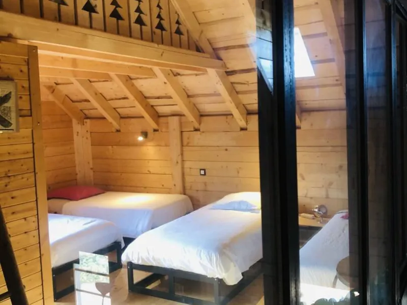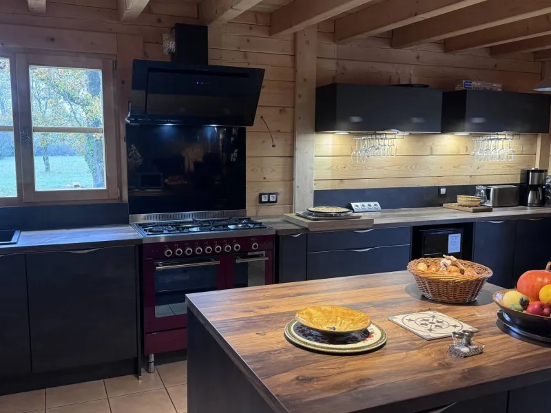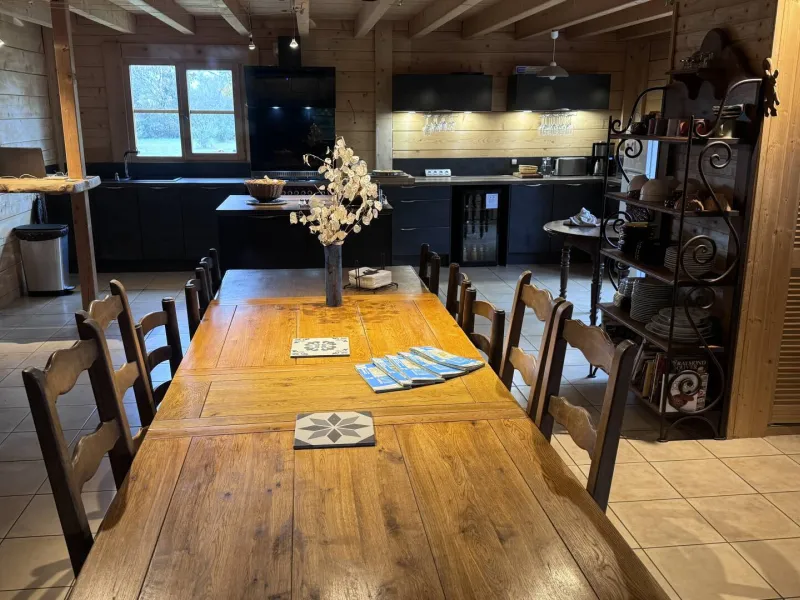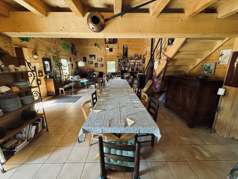 Vous profiterez de la terrasse extérieure ou de la grande salle à manger de 60 m2 de notre intérieur chalet bois, pour vos repas préparés avec gout par nos soins et pris en commun .