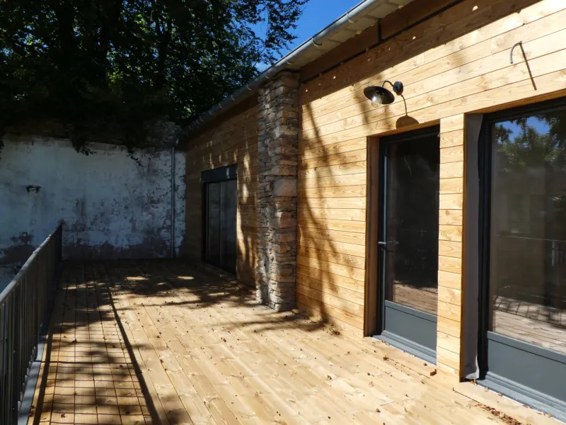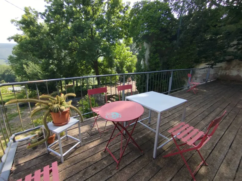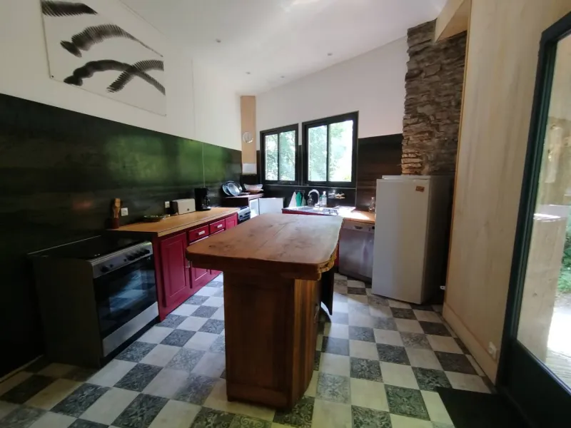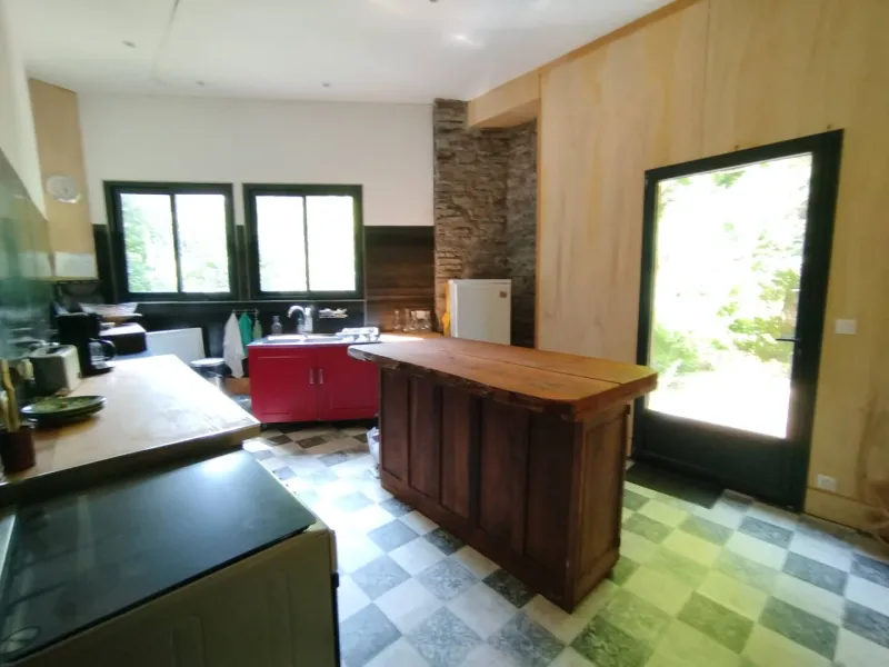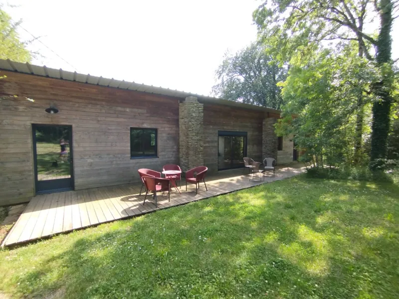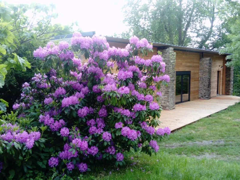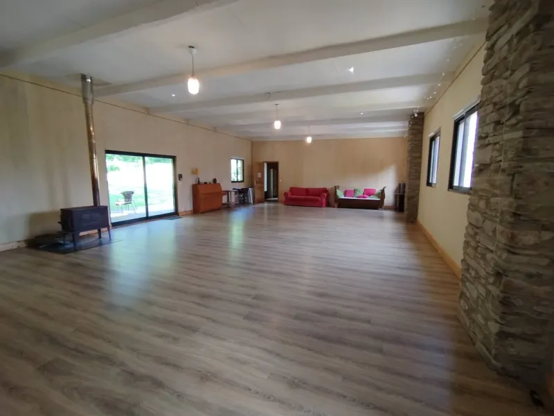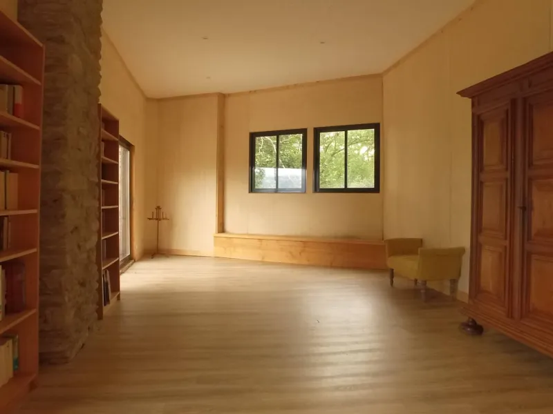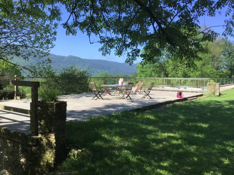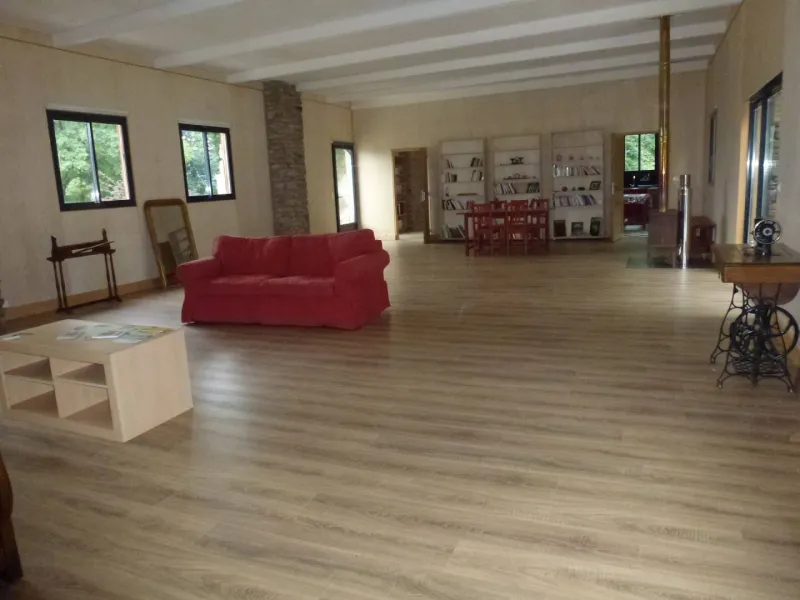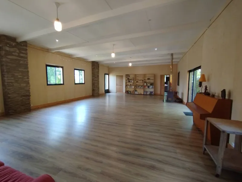 La salamandre est composée d'un hall d'entrée desservant 2 WC (dont 1 accès handicapé), d'une grande salle de 90 m2, d'un salon indépendant de 30 m2, d'une cuisine équipée collective de 15 m2, d'une terrasse suspendue de 35 m2, exposée plein sud, à l'ombre d'un hêtre centenaire et d'une terrasse de 30 m2, exposée Nord-Ouest.